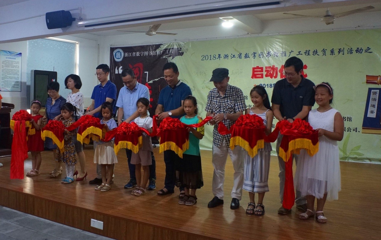 活動(dòng)現(xiàn)場,天臺(tái)縣文化廣電新聞出版局副局長陳邦軍、浙江圖書館工會(huì)主席詹利華、浙江省青少年科技活動(dòng)中心部長趙國治、臺(tái)州市圖書館館長毛旭、天臺(tái)縣圖書館館長王水球、北京方正阿帕比技術(shù)有限公司經(jīng)營中心副總經(jīng)理戴鵬、五洲融媒體科技股份有限公司副總經(jīng)理?xiàng)钊粸榇舜位顒?dòng)攜手剪彩。