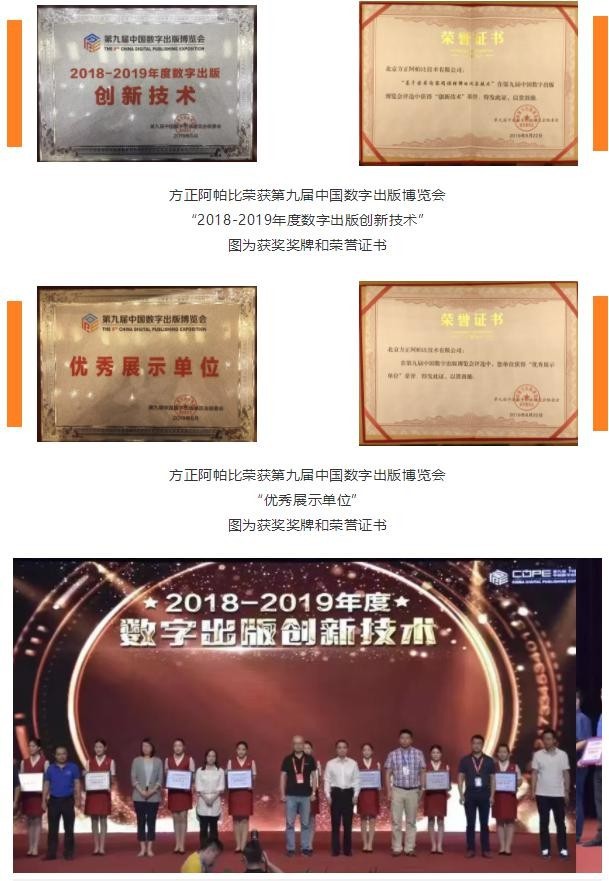 方正阿帕比榮獲第九屆中國數(shù)字出版博覽會“2018-2019 年度數(shù)字出版創(chuàng)新技術(shù)”圖為獲獎獎牌和榮譽證書