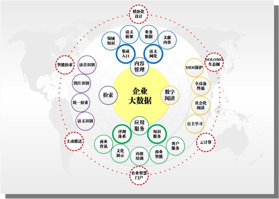 方正阿帕比提出的智慧企業(yè)概念是一種圍繞企業(yè)大數(shù)據(jù)進行的知識管理與服務的解決方案,它打破了傳統(tǒng)互聯(lián)網(wǎng)以信息形式管理文獻的方式方法,而是圍繞企業(yè)業(yè)務和培訓需要,進行企業(yè)知識的內(nèi)容管理、知識檢索、閱讀與其它智能化的應用服務,該解決方案全程對內(nèi)容進行語義化,從而使企業(yè)完成從信息化到智能化的升級轉(zhuǎn)變。
