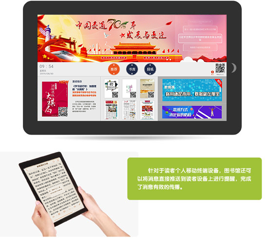 方正愛讀愛看移動終端解決方案也為圖書館提供了移動門戶解決方案:機構(gòu)可以將館內(nèi)的介紹、公告、活動等一系列信息資訊通過后臺編輯,靈活的調(diào)整到各移動終端上進(jìn)行展示。針對于讀者個人移動終端設(shè)備,圖書館還可以將消息直接推送到讀者設(shè)備上進(jìn)行提醒,實現(xiàn)了消息有效的傳播。