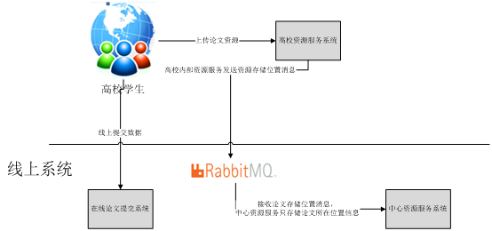 為了提高對(duì)高校使用論文提交系統(tǒng)的支持及快速響應(yīng),論文提交系統(tǒng)在線部署,高校對(duì)論文的提交、學(xué)校信息、學(xué)生信息等的管理使用線上服務(wù),可以做到有問題及時(shí)響應(yīng)。同時(shí)為了滿足高校對(duì)論文安全性的要求,本系統(tǒng)中將資源存儲(chǔ)從線上服務(wù)獨(dú)立出來形成了資源服務(wù)系統(tǒng),部署在高校。學(xué)生上傳的論文資源直接存儲(chǔ)在高校部署的資源服務(wù)系統(tǒng)中,從而達(dá)到在線提供優(yōu)質(zhì)服務(wù),線下提供資源管理服務(wù)提升論文安全性。